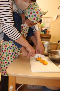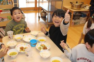 お味噌汁作り♪ 2026/03/10ひがしふくま 10月に作ったお味噌が出来上がったので、お味噌汁を作りました! 南瓜を自分たちで切って、お鍋の中に入れました。 災害時の炊き出しの練習も兼ねて、 園庭でお味噌汁と釜戸でご飯も作りました。 味噌汁は「くじらスペシャル味噌汁」と名付けられ 「世界で一番美味しい!」と言っていました♪ 5歳児 くじら組