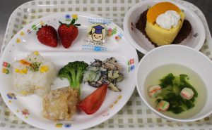 春色ご飯 2026/04/24ひがしふくま 今月のお楽しみ会メニューは ・春色ご飯 ・鶏の唐揚げ ・ひじきサラダ ・付け合わせ(トマト、ブロッコリー、いちご、チーズ) ・てまりふのすまし汁 ・ケーキ でした。 春色ご飯は、コーン、人参、しらす、あおのりが入っており 色とりどりで名前の通り春を感じました。 こども達もたくさん食べてくれましたよ! 給食室