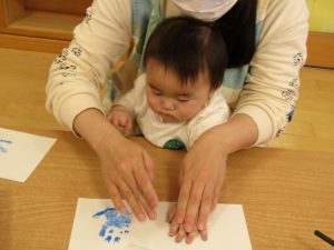 手型を取ったよ! 2026/04/27ひがしふくま 保育園に来て初めての手型取りをしました。 手に絵の具をつける感触や画用紙についた自分の手型は、普段中々見たり触ったりすることがないため 手をグーパー動かしてみたり、手型をじ~っと見つめてみたり、とても不思議そうな表情の子どもたちでした! 4月にもまた手型を取るので、これから1年間の成長がとても楽しみです♪ 0歳児 らっこ組