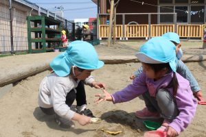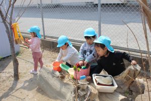 友達と遊ぶのたのしいね! 2026/03/19いろどり 天気が良く暖かい日が増えて、お外遊びを楽しむはな組さん。 1年間を通して友達と遊ぶ姿が多く見られるようになりました。 友達を「一緒に遊ぼう!」と誘い、おままごとや鬼ごっこをしたり、 「どうぞ」とおもちゃを貸したりと、遊びを通じて優しい気持ちがどんどん育っています。 他にも虫を一緒に探したり、葉っぱやお花を摘んだりと、春の自然を楽しみながら遊んでいますよ。 これからも友達とたくさん遊ぼうね! 2歳児 はな組