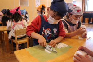 切り干し大根をつくったよ 2026/03/18いろどり 大根で切り干し大根を作りましたよ! クッキングをたくさんして包丁の使い方がとても上手になったたいよう組さん。 大根の千切りもきれいに切ることが出来ました。 切り終わった大根はお外に干して切り干し大根になるのを待ちます。 出来上がった切り干し大根は、サラダにしてみんなで食べました。 「おいしいね!」と笑顔でたくさん食べていましたよ。 お家でもぜひ作ってみてね!