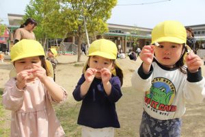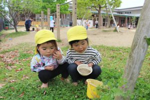 春の訪れ 2026/04/21いろどり 春の心地良さを感じながら、戸外遊びを楽しんでいるはな組さん。 園庭に咲いている桜の花びらをお皿やバケツに集めて「かわいい」「みて!」と嬉しそうに 見せてくれます。 お友達とてんとう虫やだんごむしなど、春ならではの発見に目を輝かせながら夢中になって 遊んでいますよ! これからも、沢山自然に触れながらお友達みんなで楽しく過ごしていこうね。 2歳児 はな組