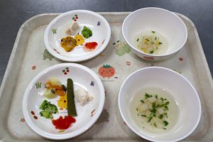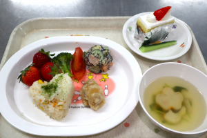 しんあいランチ 2026/04/23いろどり 保育園では毎月、誕生月の子のお祝いをするお楽しみ会があります。 その日の給食は子ども達も楽しみにしている「しんあいランチ」です! 今月のメニューは ・春色ごはん ・鶏の唐揚げ ・ひじきサラダ ・いちご、トマト、ブロッコリー ・はな麩とみつばのすまし汁 でした! 色鮮やかで春を感じることのできるメニューで、 離乳食のお友達も普通食のお友達も沢山食べてくれました! 給食室