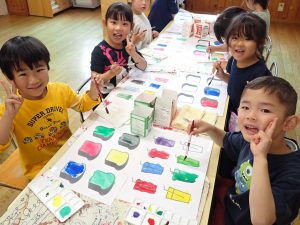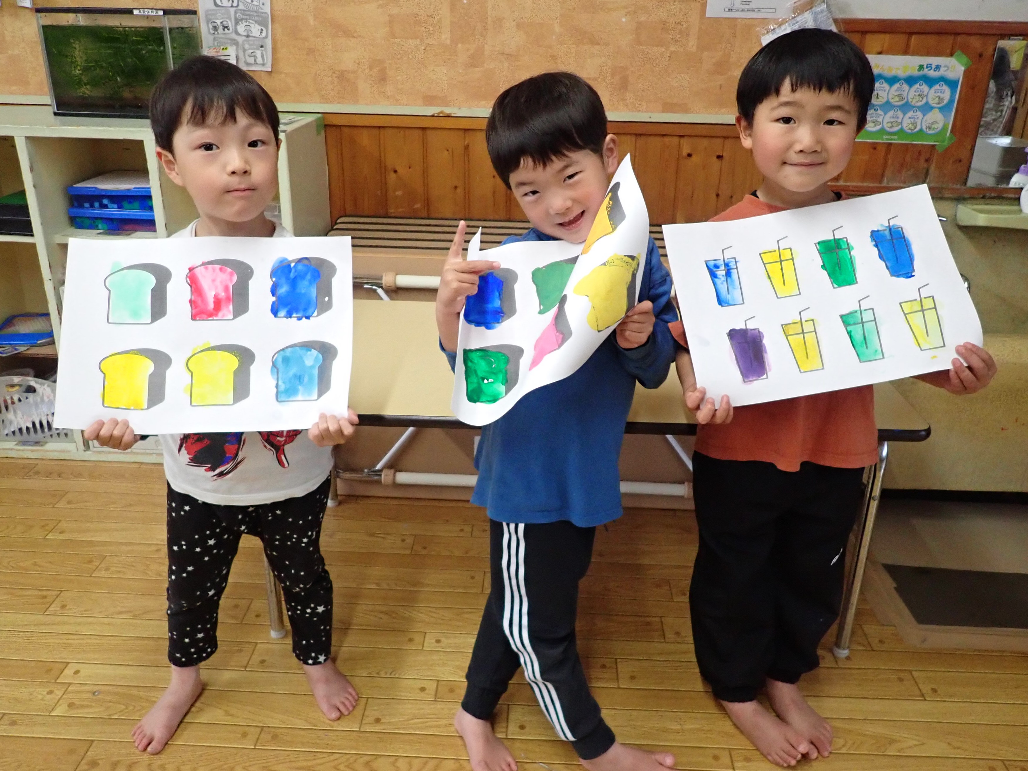 絵の具遊び! 2026/04/16真愛 ライオン組になって自分の絵の具を持つようになり、嬉しそうな子ども達。 今回は、ジュースやジャムに見立てて、絵の具遊びをしました。 「混ぜたら何色なるかな?」「紫!!」と混色を楽しむ姿が見られました。 「次はいつする?」と絵の具を使った制作を楽しみにしている子ども達でした。 ライオン組(5歳児)